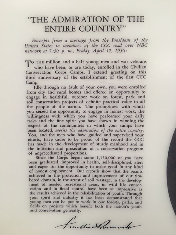 I’m becoming more and more a fan of Franklin and Eleanor Roosevelt. Eleanor’s commitment to humanity, and Franklin’s leadership qualities stand out if you look for them. As we visit the Federal, State, and Army Corp of Engineers facilities often we see plaques commemorating the services of the Civilian Conservation Corps, (CCC). The early 1930’s was a tough time for the U.S. Over a million men were offered an opportunity to engage in healthful, outdoor work on forest, park, an soil conservation projects of practical value to all the people of the nation. The boys/men were provided housing, clothing, and three meals a day. Most of their earnings were mandatorily sent home to their families, so they could also purchase food. Imagine – working for money, what a splendid idea.